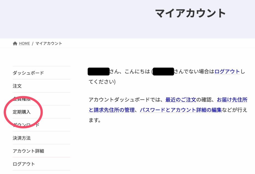 2.「マイアカウント」ページのメニューから「定期購入」をクリック。