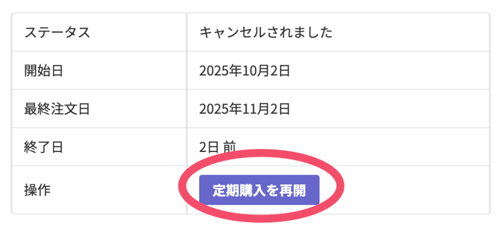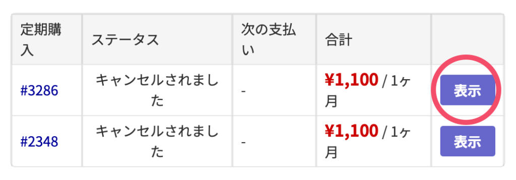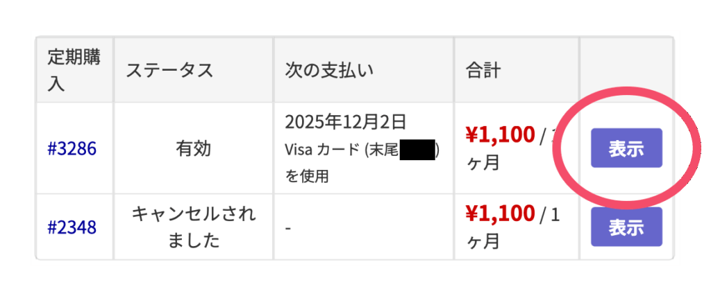 3.一覧から、ステータスが「有効」とある定期購入の「表示」ボタンをクリック。