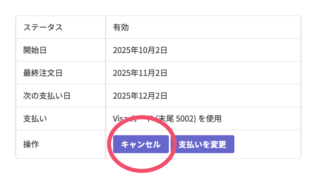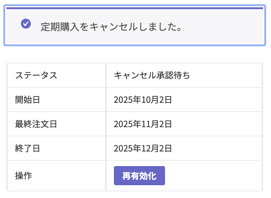 サブスクリプションを解約されますと、下記のような画面が表示され、ステータスが「キャンセル承認待ち」となります。